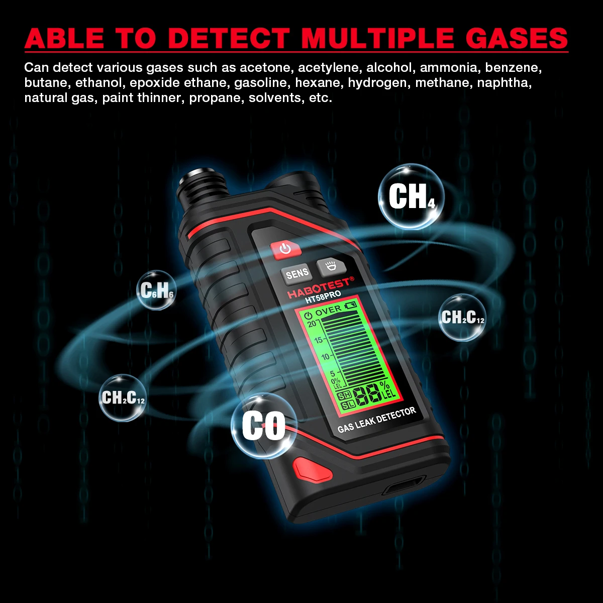 – Detected Gases (Partial List): Acetone, Acetylene, Alcohol, Ammonia, Benzene, Butane, Ethanol, Epoxide Ethane, Gasoline, Hexane, Hydrogen, Methane, Naphtha, Natural Gas, Paint Thinner, Propane, Solvents, etc.