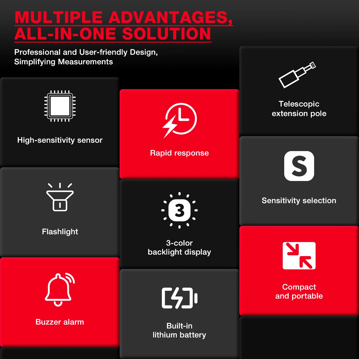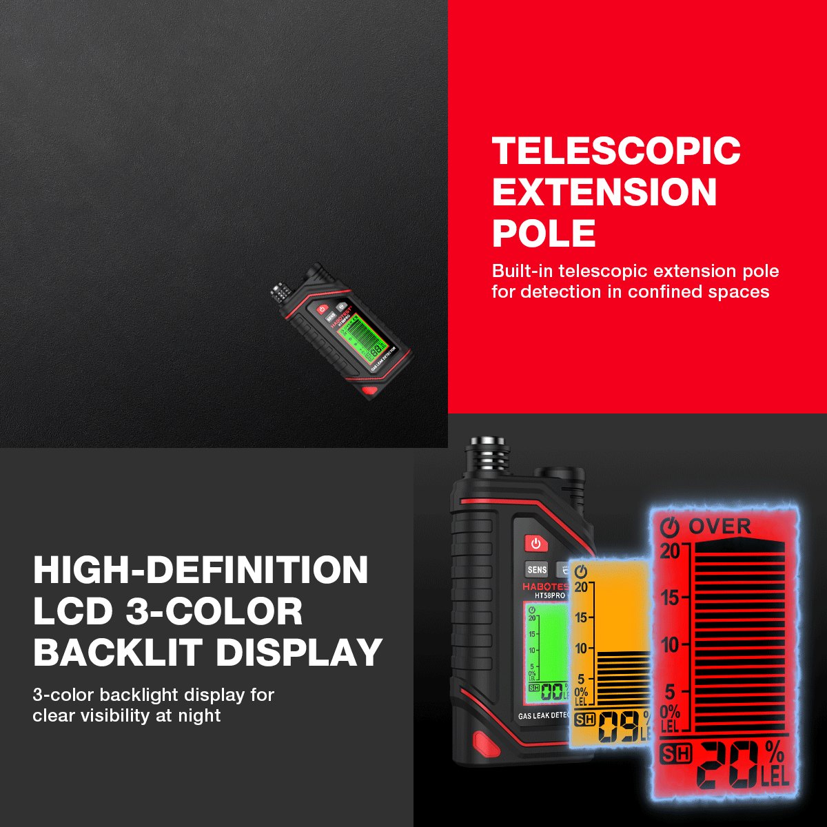 – Telescopic Extension Pole: Built-in telescopic extension pole enables detection in confined spaces.